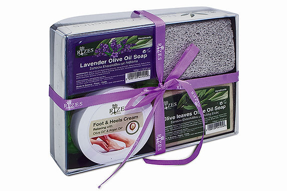 Gift set contains: Foot cream 80 ml – 2×100 gr Soaps – Pummice.